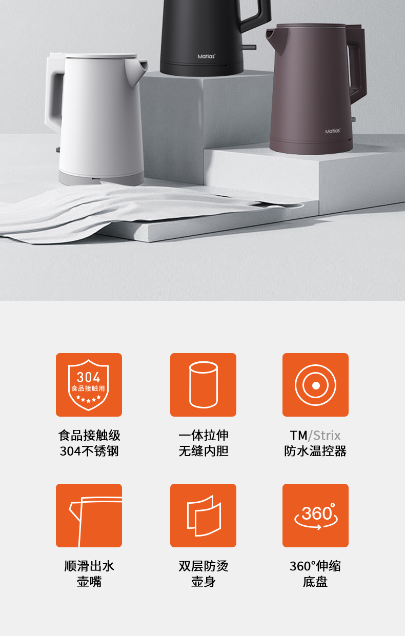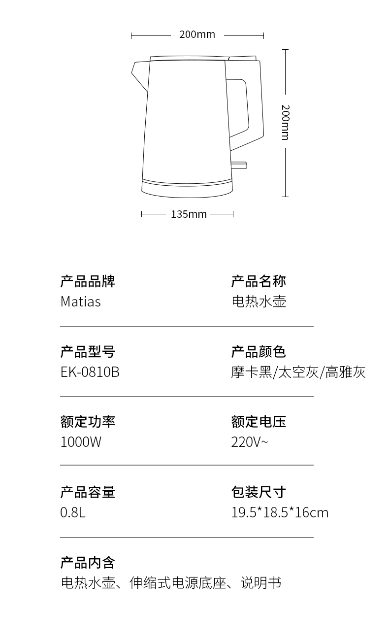 【Matias】EK-0810B 酒店专用-0.8L双层防烫电热水壶